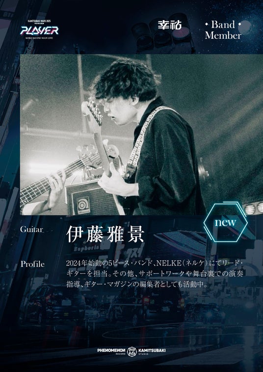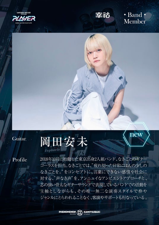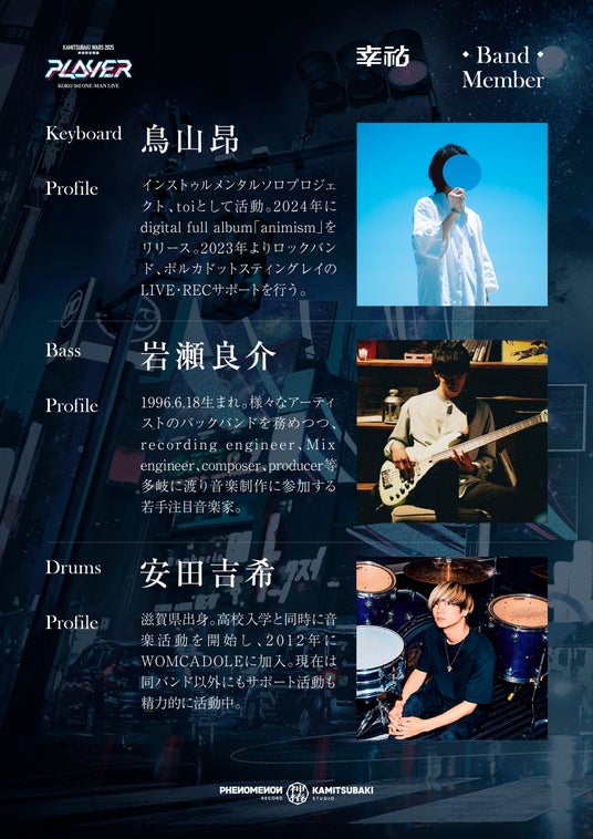 2nd Album「prayer2」を引っ提げたワンマンライブとなる本公演には、バックバンドに豪華アーティストが参加。ギターには岡田安未(なきごと)や伊藤雅景(NELKE)を起用し、「幸祜バンド」として“バーチャルロックシンガー”の名に相応しい公演をお届けします。