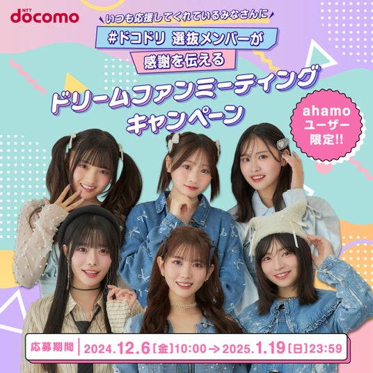 株式会社NTTドコモ(以下、ドコモ)は、「ahamo」契約者を対象に、#ドコドリ 選抜メンバー※(以下、メンバー)が自ら企画したファンミーティングに抽選で240名さまをご招待する「#ドコドリ ドリームファンミーティングキャンペーン」(以下、本キャンペーン)を2024年12月6日(金)から 2025年1月19日(日)までの期間で開催いたします。