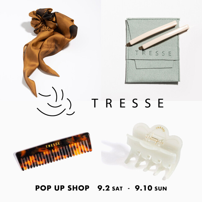 ヘアアーティストshucoが手掛ける上質なヘアアクセサリー。ブランド名の「TRESS(トレス)」はフランス語で"三つ編み"という意味。 大人になっても、初めて三つ編みをしてワクワクした子供の頃のように、ヘアスタイルを楽しんでもらいたいという意味が込められています。 9/9(土)には、デザイナーのshuco氏によるヘアアレンジイベントを予定しております。
