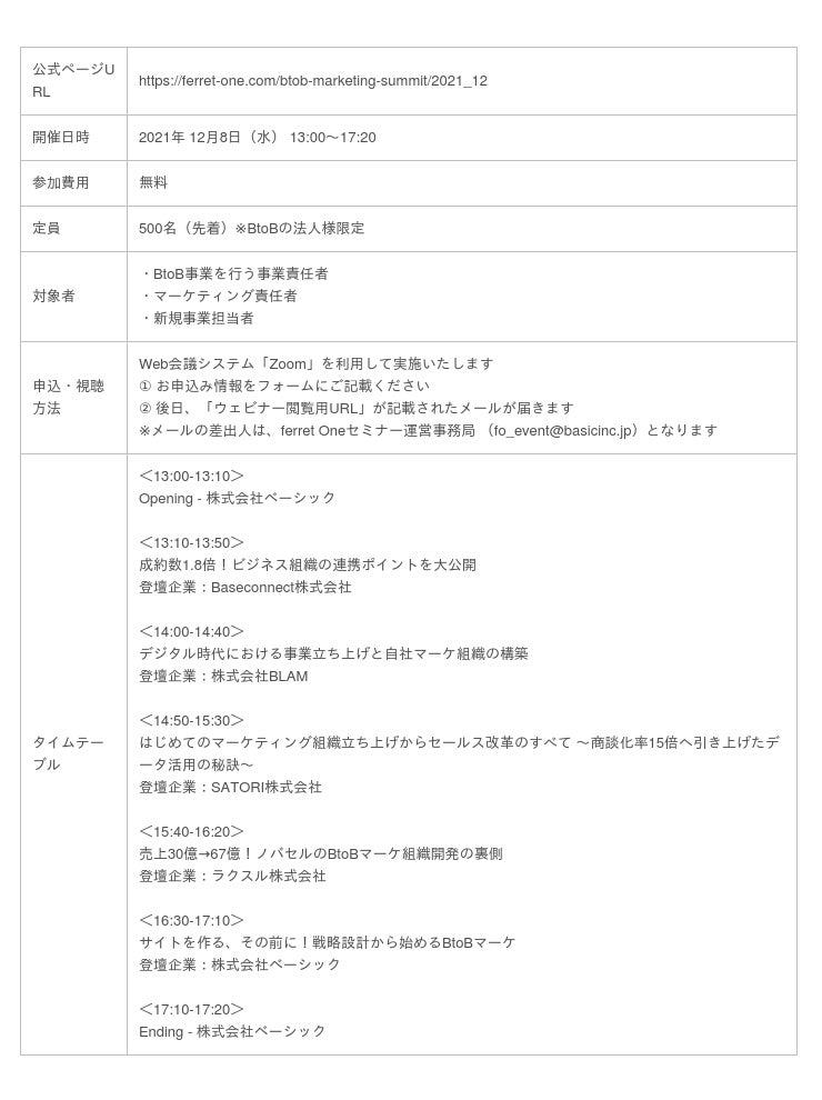 オールインワン型BtoBマーケティングツール「ferret One(フェレットワン)」を運営する株式会社ベーシック(本社:東京都千代田区、代表取締役:秋山勝、以下ベーシック)は12/8(水)13時より、BtoB事業を行う事業責任者やマーケティング責任者、新規事業担当者の方に向けたイベント「BtoB Marketing Summit 2021 デジタル化時代のマーケ組織の立ち上げ方~経験者が語る、必ず押さえるべき3つのポイント~」を開催いたします。