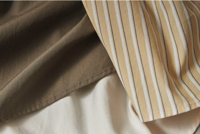 新作「ブライトン」のために四方さんがチョイスしたのは3種類の生地。 いずれもコーディネートしやすく、かつ装いに新鮮さを呼び込める色柄です。