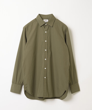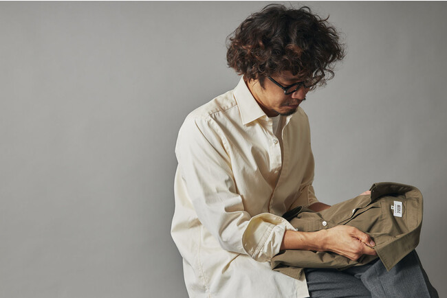 「ブリティッシュミリタリーをイメージして選んだカーキ色です。 骨太なムードを色濃く感じさせる色なので、あえて素材は軽やかなタイプライターを選んでラギッドに見えすぎないよう意識しました。 軍モノのシャツよりもサラリと洗練された雰囲気で着こなしていただけると思います」 (四方さん)
