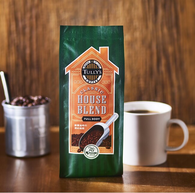 タリーズコーヒーで長年愛され続ける「ハウスブレンド」は、ほどよいボディとすっきりとした酸味、スムースな飲み口が特徴で、バランスが良く飲みやすく、タリーズの看板商品ともいえるコーヒー豆です。その味わいは、誰もが親しみやすく、「多くのコーヒー愛好家に愛されるブレンド」を目指し、私たちの想いを受け継いできました。今回は、日本での創業25周年を記念して、米国シアトルに店舗を構えていた当時の味わいを再現し、現在販売している「ハウスブレンド」よりも深煎りで仕上げた特別な味わいをお届けします。しっかりとしたコクと深みのあるボディが特徴で、豊かなコクの中にもほのかな酸味が感じられます。