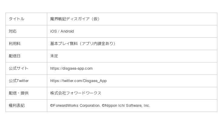 株式会社フォワードワークス(以下、FW)は、株式会社日本一ソフトウェアと共同開発しているスマートフォン向けゲーム「魔界戦記ディスガイア(仮)」の情報公開日を2019年2月7日(木)に決定いたしました。本告知に併せて、本日2月4日(月)より、カウントダウンサイトの公開および公式Twitterにてプレゼントキャンペーンを開始いたしました。
