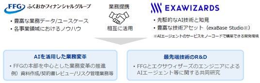 株式会社ふくおかフィナンシャルグループ(取締役社長 五島 久、以下「FFG」)は、株式会社 エクサウィザーズ(代表取締役社長 CEO 春田 真、以下「エクサウィザーズ」)と、AIを活用した業務変革 および 最先端技術のR&D を目的とした業務提携契約を締結しましたので、下記の通りお知らせします。