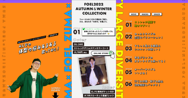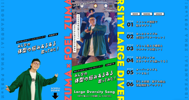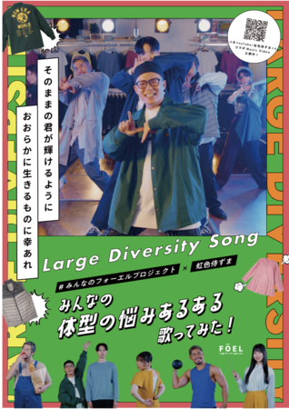 今年の春から始まった「#みんなのフォーエルプロジェクト」では、これまで「Large Diversity Interviews」や夏の「Large Diversity Presents」を通じ、ユーザーの皆さんの声を集めてきました。その声を基に虹色侍ずまが 楽曲「みんなの体型の悩みあるある」を制作。歌詞の1番ではユーザーのリアルな「体型の悩みあるある」を、2番ではその悩みに応える、フォーエルの商品部や接客に込めた想いを歌い上げました。Movieでは、ダンサーたちがフォーエルのオリジナルブランドEL.FO(エルフォ)の服をはじめとした様々なアイテムを身にまとい、ダイナミックなダンスで機能性と動きやすさを体現しています。虹色侍ずまが初めて挑んだダンスにも注目です。