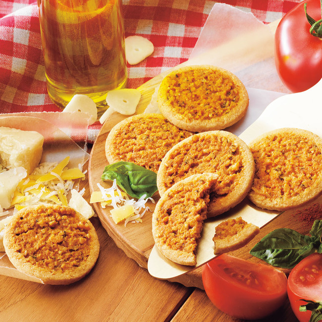 トマトパウダーやハーブ、スパイスなどの風味が広がる生地と、チーズパウダー(チェダー・ゴーダ・パルメザンなど)を練りこんだ生地の2つが織りなすハーモニーは、まるでピザを食べているかのよう。オートミールのザクッとした食感や香ばしさ、様々なスパイスの香りが食欲をそそり、次から次へと食べたくなるようなクッキーです。