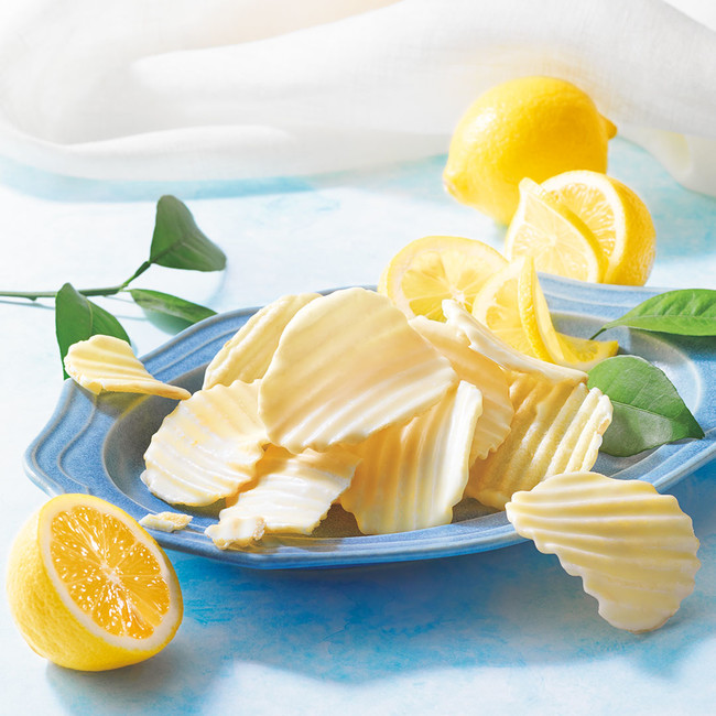 さわやかな酸味が特長のレモンチョコレートをポテトチップの片面にコーティング。レモンの味わいが引き立つよう、レモンチョコレートにはチーズ風味・ヨーグルト風味のチョコレートを隠し味に加えています。レモンのさわやかな香りと酸味、ポテトチップの塩味がひとつになり、塩レモンを思わせる味わいです。