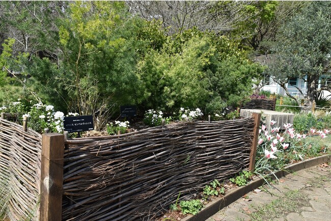 レイズドベッドとは、枠を設けて地面より高い位置につくられた花壇です。地表から植栽レベルを上げることで地温を確保し寒さによる痛みを軽減。水はけ、風通しも良くし、健全な植物の生育を促します。黒竹の柱にヤマハギの枝を通して編み上げた自然素材のため、周囲の植物との一体感のあるデザインとなっています。