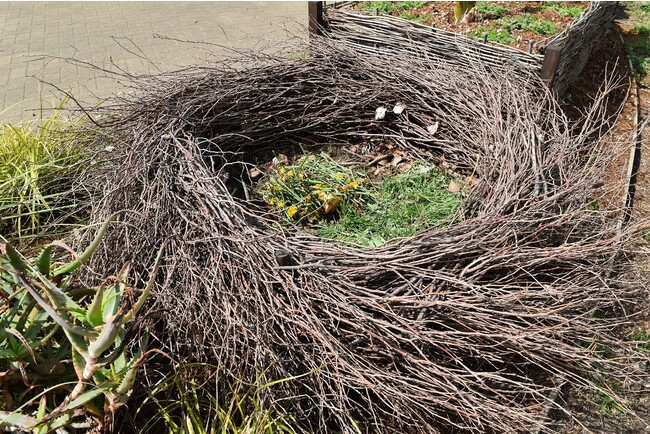 コンポストとバイオネストを使って、ガーデン内の枯れ葉や枝、花殻などを堆肥化し、還元します。大きな鳥の巣のようなバイオネストは、昆虫やミミズなどの分解者の住処の役割も果たしています。