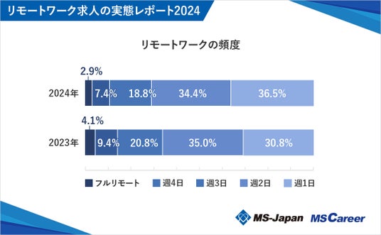 2024年は「フルリモート」が2.9%、「週4日」が7.4%、「週3日」が18.8%、「週2日」が34.4%、「週1日」が36.5%でした。