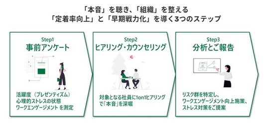 本サービスでは、専門家が本人から上司や人事には言えない「本音」を引き出し、個人の適応をサポートします。同時に、不調や離職の予兆を組織課題としてフィードバックすることで、企業の持続的な成長に寄与いたします。