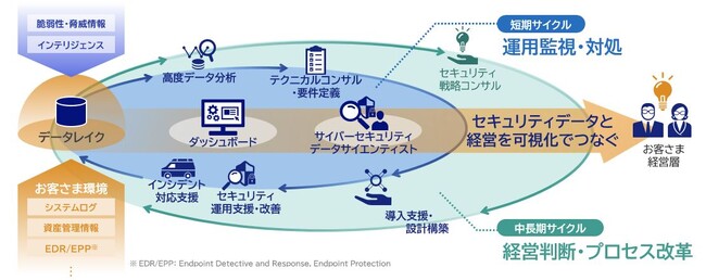 本サービスは、セキュリティ運用監視データを起点に、ダッシュボードにより俯瞰的に対策状況を分析・可視化し、セキュリティ戦略策定支援から導入・運用・監視・対処までをEnd to Endで提供する新サービスです。