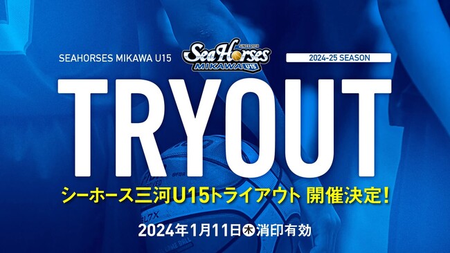 この度、2024年度入団生対象の「シーホース三河U15 トライアウト」を2024年1~2月に開催します。2023年度、小学5年生~中学2年生の方が対象となります。