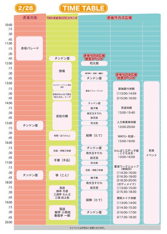 内容:赤坂芸者による舞とパレード、茜染め体験、茶道体験、展示、落語、子供歌舞伎など