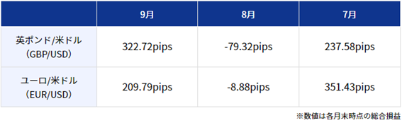 8月のレポートでも「もどかしいユーロ/米ドルと英ポンド/米ドル」と取り上げた2通貨ですが、9月はよく動きTOP100の「エージェント」総合損益は好転しました。