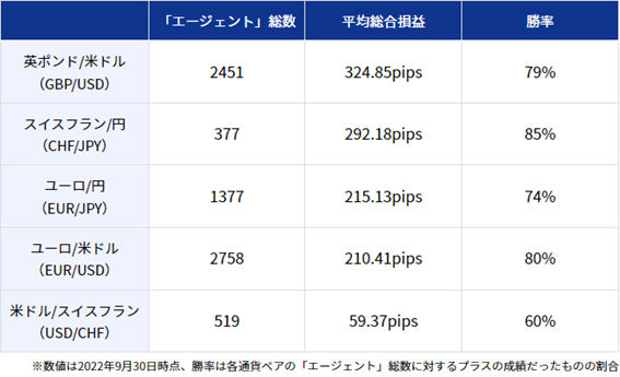 7~9月の通貨ペア別TOP100「エージェント」総合損益