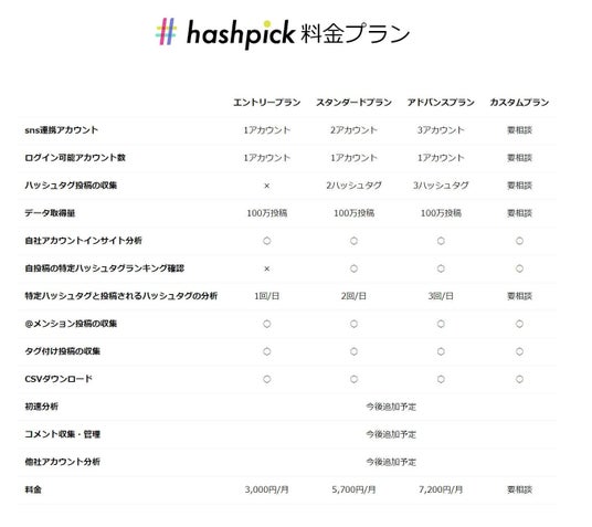 「hashpick」では、ご希望の利用料に応じて「エントリープラン」「スタンダードプラン」「アドバンスプラン」をご用意しています。詳細はお問合せください。