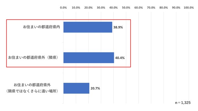 続いて、「普段、ドライブに行く」と回答した人へ【コロナ禍になる前】のドライブでは、どのエリアによく行っていたのかを質問したところ「自身が住んでいる都道府県外(隣県)」が40.4%、「自身が住んでいる都道府県内」 が38.9%という回答結果になりました。