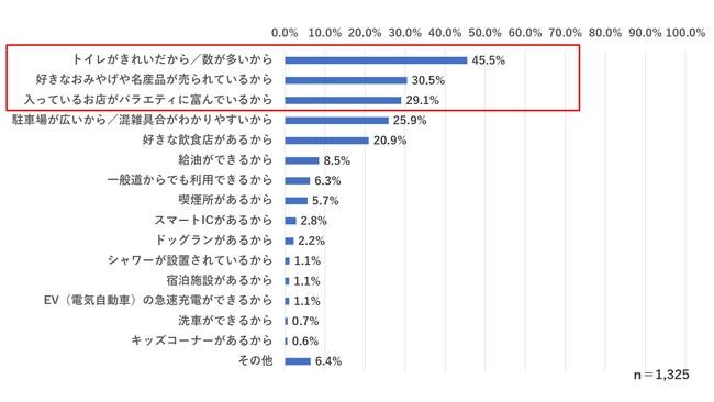 続いて、おすすめのサービスエリア・パーキングエリアを回答してくれた人へその理由を聞くと、「トイレがきれいだから/数が多いから(45.5%)」「好きなおみやげや名産品が売られているから(30.5%)」「入っているお店がバラエティに富んでいるから(29.1%)」という回答が上位となりました。