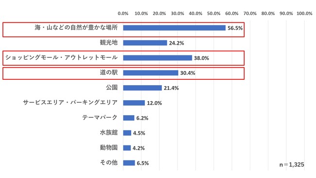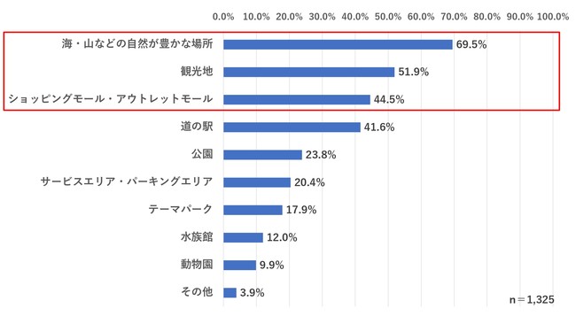 また、【コロナ禍になる前】のドライブで行っていた場所としては「海・山などの自然が豊かな場所(69.5%)」「観光地(51.9%)」「ショッピングモール・アウトレットモール(44.5%)」という回答が上位にあがりました。