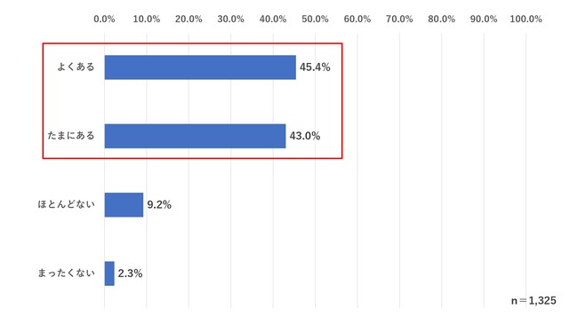また、ドライブ中にサービスエリアやパーキングエリアに立ち寄る機会に関しては「よくある(45.4%)」「たまにある(43.0%)」という結果となり、全体の約9割の人が立ち寄っていることがわかりました。