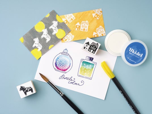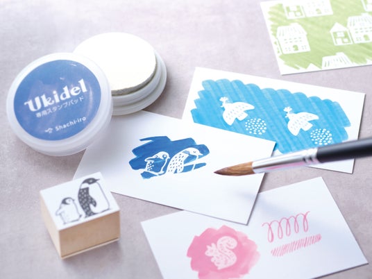 「ウキデル」は、水性染料インキを弾く特殊インキを採用した白色のスタンプパッドです。ウキデルを使用してお手持ちのゴム印を押した印影の上から万年筆インクや水性ペンで塗ると、色を弾いてイラストが浮き出たように見えます。さまざまな色の万年筆インクを持っていても使い切れないという方におすすめのアイテムです。万年筆インクの色見本やポストカードデコなどアイデア次第でいろいろな使い方ができます。