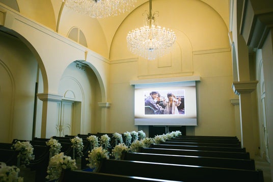 チャペルでの挙式入場直前に上映することで、ご新郎ご新婦の人柄や家族との関係性が事前にお披露目され、その場にいる全員が感動的な雰囲気に包まれての入場シーンが叶います。事前にご新郎ご新婦からメッセージや写真をお預かりして投影するため、おふたりらしさが伝わるムービーが上映できます。