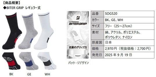 ブリヂストンスポーツ株式会社は、ゴルファーの足元を支えるサポート機能ソックスの『HYPERSOX』シリーズから、ゴルフシューズの中で足裏の滑りを抑制し、ゴルファーのパフォーマンスを引き出すことを目指した新カテゴリーのゴルフソックス『BITER GRIP』をレギュラー丈とアンクル丈で発売します。価格は商品概要に記載の通りです。
