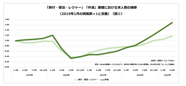 新型コロナの5類移行や、円安を背景に旅行需要が急回復。これを受け、レジャー・外食業界ではお客様に旅行プランを提案する「店頭営業」や、ホテルの予約管理を行う「フロントスタッフ」のポジションで求人が増加。