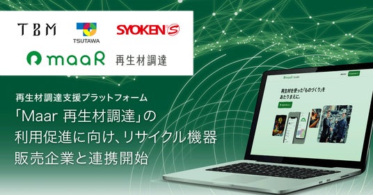 株式会社 TBM(本社:東京都千代田区、代表取締役 CEO:山崎敦義、以下 TBM)は、この度、製造業者向けのBtoB フリマアプリ「tsutawal(ツタワル)」を運営する株式会社ツタワ(本社:大阪府大阪市、代表取締役社長:津田和 淳一、以下ツタワ)及び破砕機や粉砕機などのリサイクル機器の販売を行う商研株式会社(本社:広島県広島市、代表取締役:斎藤良平、以下商研)とトレーサビリティ情報等を付与した再生材や再生原料(以下、再生材等)の調達を支援するプラットフォーム「Maar 再生材調達」の普及に関する連携を開始します。各社が有する再生材メーカー(リサイクラー、コンパウンダー)のネットワークを活用して、 「Maar 再生材調達」を通じた再生材の流通を促進し、再生材市場の活性化や資源循環産業の発展を目指していきます。