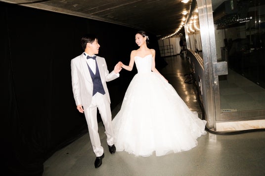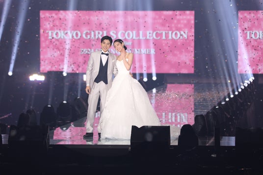 TGC当日のステージでは、会場が暗転するとスクリーンに昨年11月に撮影されたこーくんのみの動画が映し出され、今からなごみにプロポーズをすることを告げると、客席から大きな歓声があがりました。そして、感動的なプロポーズ時の映像とともに、純白のウエディングドレスとタキシードに身を包んだ二人が腕を組んでランウェイに登場。ランウェイトップではこーくんが跪いて指輪を渡す演出もあり、会場はあたたかい拍手と祝福ムードに包まれました。