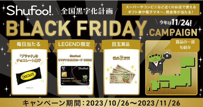 TOPPANグループの株式会社ONE COMPATHが運営する国内最大級の電子チラシサービス「Shufoo!(シュフー)」は、“全国黒字化計画”をテーマに「ブラックフライデーキャンペーン」(以下 本キャンペーン)を2023年10月26日(木)から11月26(日)の期間で開催します。現金3万円や近くのお店で使える商品券・電子マネーを賞品としてご用意し、日々のお買いものが楽しくなるきっかけを提供いたします。