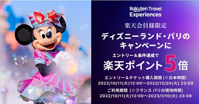 楽天グループ株式会社が運営する旅行体験予約サービス「楽天トラベル 観光体験」は、フランスのディズニーランド・パリの開園30周年にあわせて、同園のキャンペーン対象のチケットを購入して利用すると「楽天ポイント」を通常の5倍(注)進呈するキャンペーンを、2022年10月11日(火)~12月20日(火)の予約期間を対象に実施します。