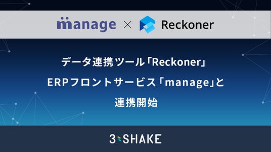 株式会社スリーシェイク(本社:東京都新宿区、代表取締役社長:吉田 拓真、以下スリーシェイク)は、提供するクラウド型データ連携ツール「Reckoner(レコナー)」と、株式会社COEL(本社:愛知県名古屋市西区、代表取締役社長:深見 和久)が提供する、ERPフロントサービス「manage(マネージ)」がAPI連携を開始したことをお知らせいたします。