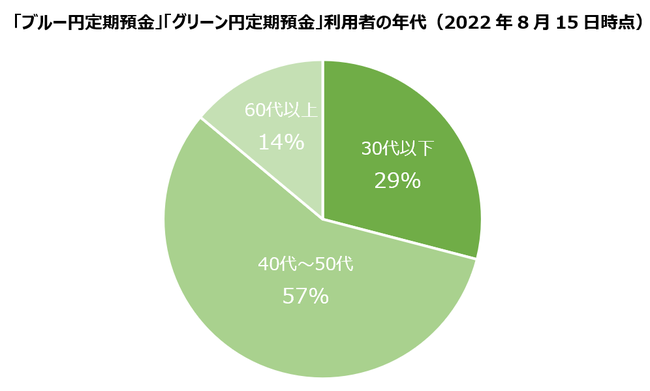 「ブルー円定期預金」「グリーン円定期預金」をご利用いただいているお客さまはその他キャンペーンの円定期預金の割合(30代以下22%、40代~50代57%、60代以上21%) と比較すると30代以下の比率が高く、若年層のお客さまからも興味関心をいただいています。
