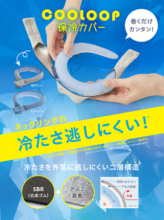 COOLOOPが完全に溶けきるまでの時間を30分長持ちさせるカバーが登場!断熱性の高いクロロプレンゴム+アルミ蒸着で冷たさを外気に逃がしません。ホック付きなので首の細い女性やお子様が使う時のズレを防ぎます。カラーは、Mサイズ用のグレーと、Lサイズ用のネイビー。