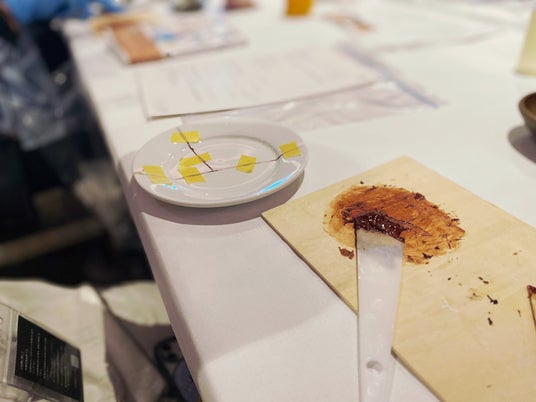 今回のワークショップでも、参加者の方が欠けたり割れてしまった大切な器を各自持ち寄りスタートいたしました。金継ぎの全5工程のうち1工程をワークショップで行い、残りの4工程は参加者自身で修繕できるよう堀道広さんよりレクチャーを実施。質疑応答や4工程のシュミレーションを行いつつ、丁寧に金継ぎについて教えていただきました。