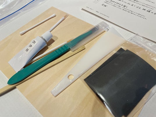 ここからは約1週間の乾燥期間が必要なため、残りの4工程は参加者ご自身で修繕できるよう、堀道広さんよりシュミレーションを行いつつレクチャーをいただきました。堀道広さんがそれぞれの工程の見本を持参し、参加者の間で回覧しながら興味深くお話と説明をお聞きしました。