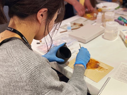 4工程目・5工程目では、漆を塗って、ついに金継ぎの仕上げである金属粉を蒔き付ける作業へ。