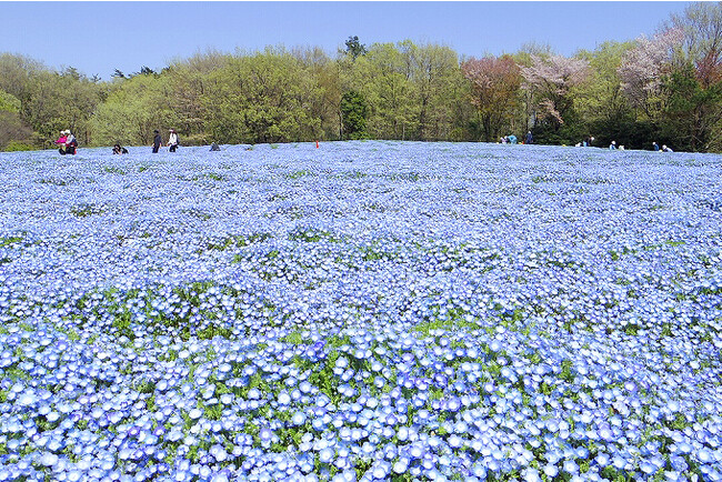 ポピーと一緒に4月上旬から見頃を迎える青い絨毯のような「ネモフィラ」