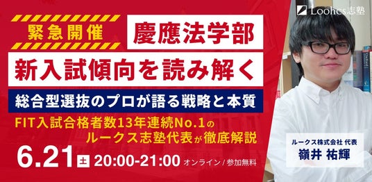 2026年度から慶應法学部FIT入試が激変──出願書類・口頭試問の大幅改訂を受けて、最多合格実績を誇る「ルークス志塾」が最新情報と対策法を緊急発信。高校生・保護者向けオンラインイベントを無料開催します(6月21日開催/Zoom/要事前申込)。