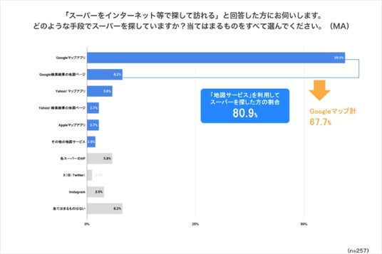 その上で、インターネットを活用して店舗を探している全体の25.7%の消費者に対して、どのような手段でスーパーを探しているか調査を行いました。
