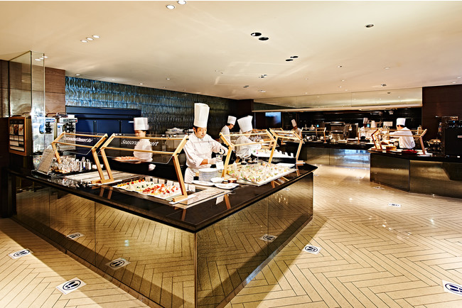 「ヘルシー、ビューティー、フレッシュ」をコンセプトに、ライブ感あふれるブッフェスタイルを展開するシェフズ ライブ キッチンは、シェフが目の前で料理するパフォーマンスをお楽しみいただけます。ブッフェの前にテーブルへお届けするファーストディッシュ「コラーゲンたっぷり美肌&健康スープ」は、当店自慢の一品です。少人数グループに最適な個室もございます。