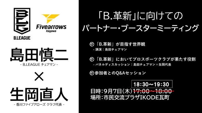 公益社団法人ジャパン・プロフェッショナル・バスケットボールリーグ代表理事 CEO(チェアマン)島田 慎二氏がクラブを激励するため、香川県に来ることが決まりました。それに合わせて、『「B.革新」に向けてのパートナー・ブースターミーティング』を開催いたします。開催時間が変更となりましたので、ご確認ください。