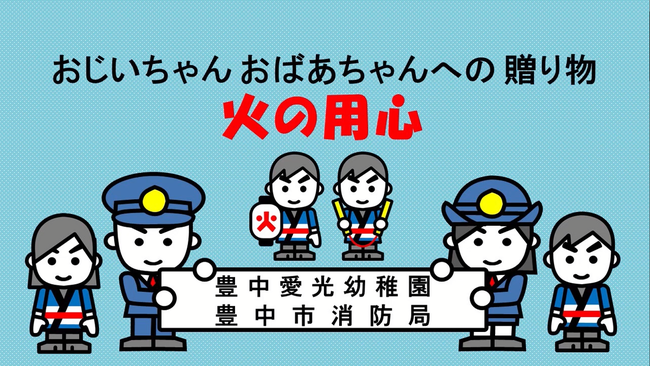 動画では、豊中愛光幼稚園の園児が「おじいちゃん・おばあちゃんへの贈り物」として、祖父母や家族に火災予防を呼びかけます。市公式ユーチューブ「とよなかチャンネル」で配信するほか、公共施設や健康情報拠点薬局(※)に設置の電子掲示板(デジタルサイネージ)で放映します。啓発により、火災による死傷者の軽減を図ります。