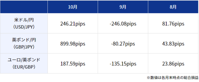 5位は米ドル/円です。9月は平均総合損益ランキングで最下位でしたが、驚異のジャンプアップ。9月、10月と日銀の為替介入が行われ、市場参加者の米ドル/円への注目度もUPしているでしょう。