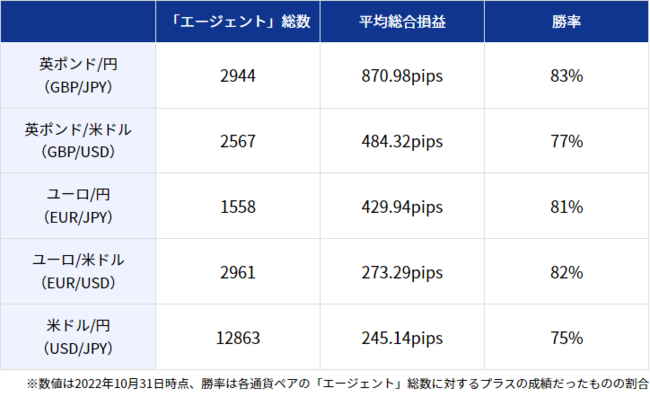 このレポートでも常々紹介していますが、「エージェント」が得意とするのは価格がよく動く/トレンドのある通貨ペアです。次月以降も続くかは分かりませんが、やはりこうした通貨ペアは注目しておいても損はないでしょう。