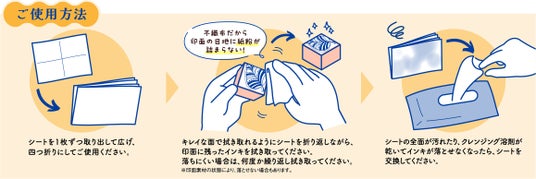 ・クレンジング溶剤が浸透したシートタイプのスタンプインキクリーナーなので、拭き取るだけでゴム印・消しゴムはんこの印面に残ったインキを落とせます。