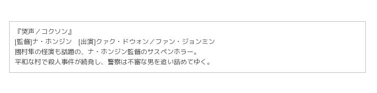 第3回目となる今月の監督は、カンヌ映画祭で大きな話題となり、國村隼の怪演が話題を呼んだ『哭声/コクソン』 をはじめ、先の読めない展開と独特な世界観でジャンルを超えて次々と話題作を世に送り出している、今注目の韓国人監督ナ・ホンジン。